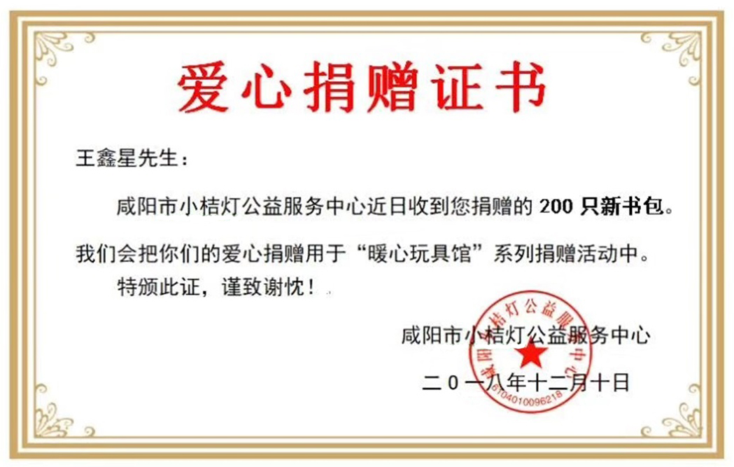 王鑫星同学出生陕西安康平利一个普通的三口之家,家里经济条件非常一般。他从小自强独立,乐于助人,在校各方面表现优秀。为了给家庭减少负担,他还利用寒暑假外出打工,缓解家庭经济压力。据了解,王鑫星捐赠的这批书包是用自己暑假实习打工所得购买捐赠的,这批书包将全部用于小桔灯“暖心玩具馆”系列自选捐赠活动中,为更多需要的孩子带去爱心与温暖。王鑫星同学的善行义举充分体现了了当代大学生有担当、有责任的良好品质,也彰显了工院学子的风采。