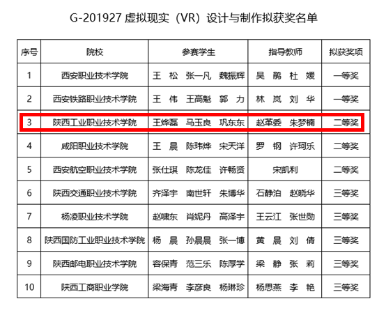 3月27日,2019年陕西省职业院校技能大赛“虚拟现实(VR)设计与制作”赛项比赛在西安职业技术学院落下帷幕。经过一天的激烈角逐,由乐游棋牌信息工程学院教师赵革委、朱梦楠指导,软件1704班马玉良、王烨磊和数媒1704班巩东东三名同学组成的代表队荣获团体二等奖。