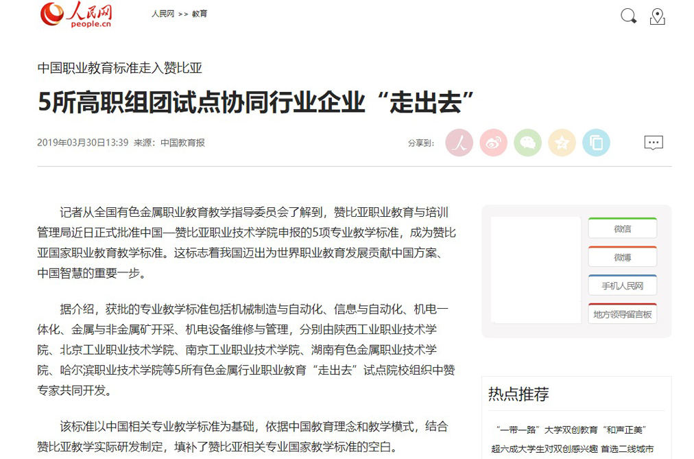 近日,人民网、《中国教育报》等媒体聚焦报道中国-赞比亚职业技术学院获得赞比亚批准,由乐游棋牌牵头制定的机械制造与自动化等5项中国职业教育标准正式成为该国官方标准。这也是乐游棋牌在建设国家优质、陕西一流,争创“双高”高职院校进程中,为世界职业教育发展提供的工院方案,贡献的工院智慧。全文链接如下:
