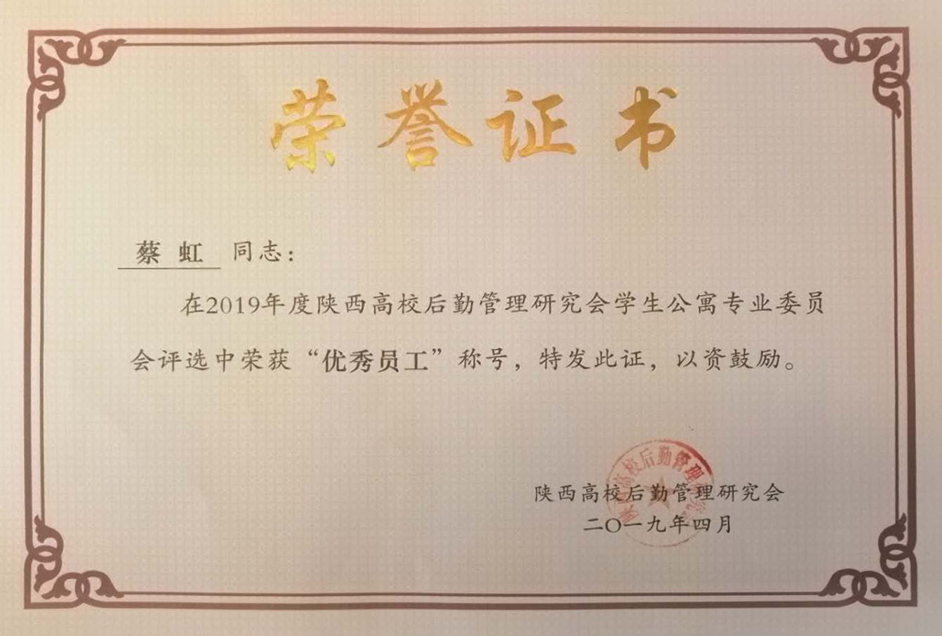 4月12日,陕西高校后勤管理研究会学生公寓专业委员会2019年年会在汉中举行。乐游棋牌学生处公寓管理中心荣获陕西高校学生公寓“先进集体”,公寓管理中心齐智同志获陕西高校学生公寓“服务标兵”、蔡虹同志获陕西高校学生公寓“优秀员工”称号。