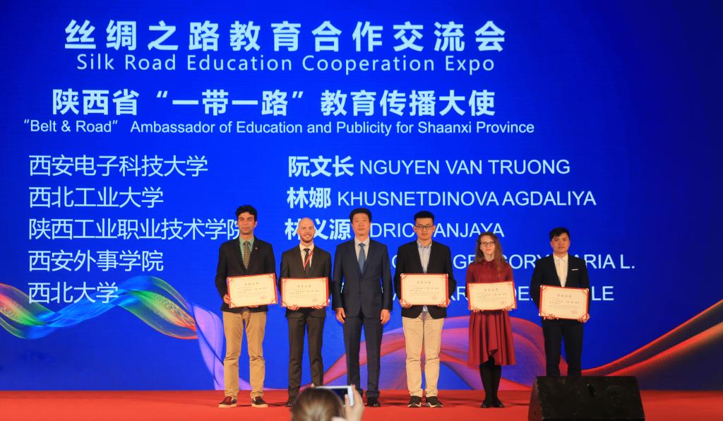 乐游棋牌留学生林义源同学(右三)获“陕西省‘一带一路’传播大使”