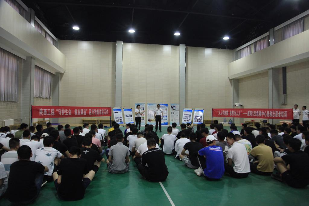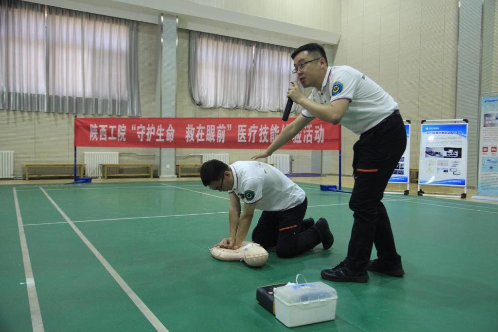 活动中,咸阳市中心医院急救中心队长虢涛为前来参加活动的150多名师生代表详细讲解和现场示范了面对心搏骤停、气道异物梗塞等紧急情况,如何在第一时间进行现场急救的知识和技能。在咸阳市中心医院急救中心医护人员的指导下,大家了解了除颤仪的使用、心肺复苏术的救护步骤和海姆立克急救法的操作要领,20多名师生还现场利用模型进行了心肺复苏术的操作训练。
