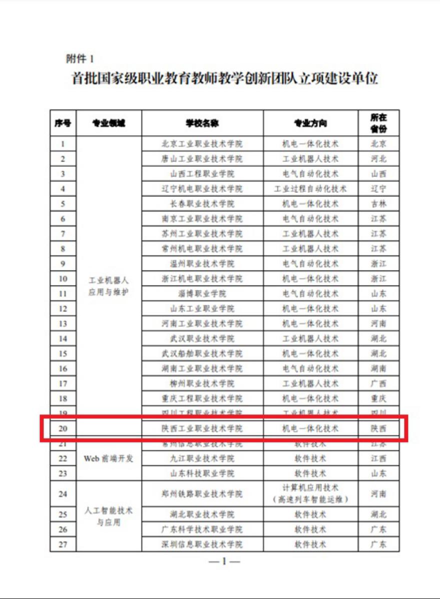 2019年7月,按照教育部“全国职业院校教师教学创新团队”建设工作安排,乐游棋牌积极筹备申报工作。经过校内遴选、学院申报、省教育厅初评、教育部评审等环节,“机电一体化技术”教学创新团队通过评审。全国首批国家级职业教育教师教学创新团队立项建设单位共120个,陕西省共3所高职院校入选。