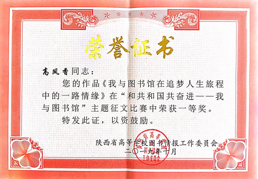 日前,由陕西高校图工委举办的“和共和国共奋进——我与图书馆”主题征文比赛结果揭晓,乐游棋牌图书馆馆长高凤香教授撰写的《我与图书馆在追梦人生旅程中的一路情缘》喜获征文比赛一等奖。