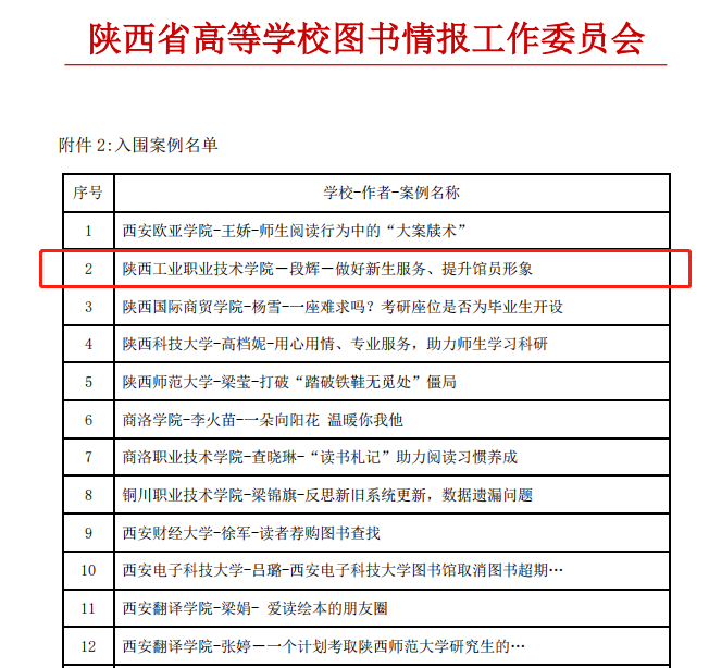 近日,陕西省高等学校图书情报工作委员会公布了“陕西高校图书馆员读者服务典型案例展示交流会”入围名单,乐游棋牌图书馆段辉提交的《做好新生服务、提升馆员形象》顺利通过专业评审,入围有效选题,获得后续比赛资格。