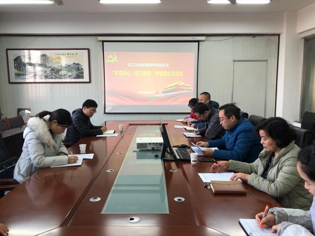 12月3日,化工与纺织服装学院党总支召开“不忘初心、牢记使命”专题民主生活会,学院党委副书记田昊同志、学院主题教育第三指导督察组甘蓉同志全程指导督导,化纺服学院党总支书记王化冰、院长贾格维、总支委员、各支部书记参加会议,会议由化纺服学院党总支书记王化冰主持。