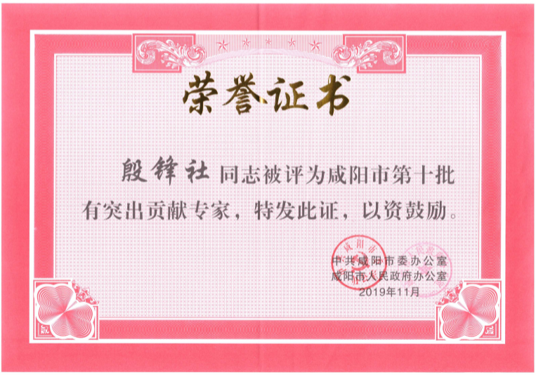 殷锋社教授获得“咸阳市第十批有突出贡献专家”荣誉称号