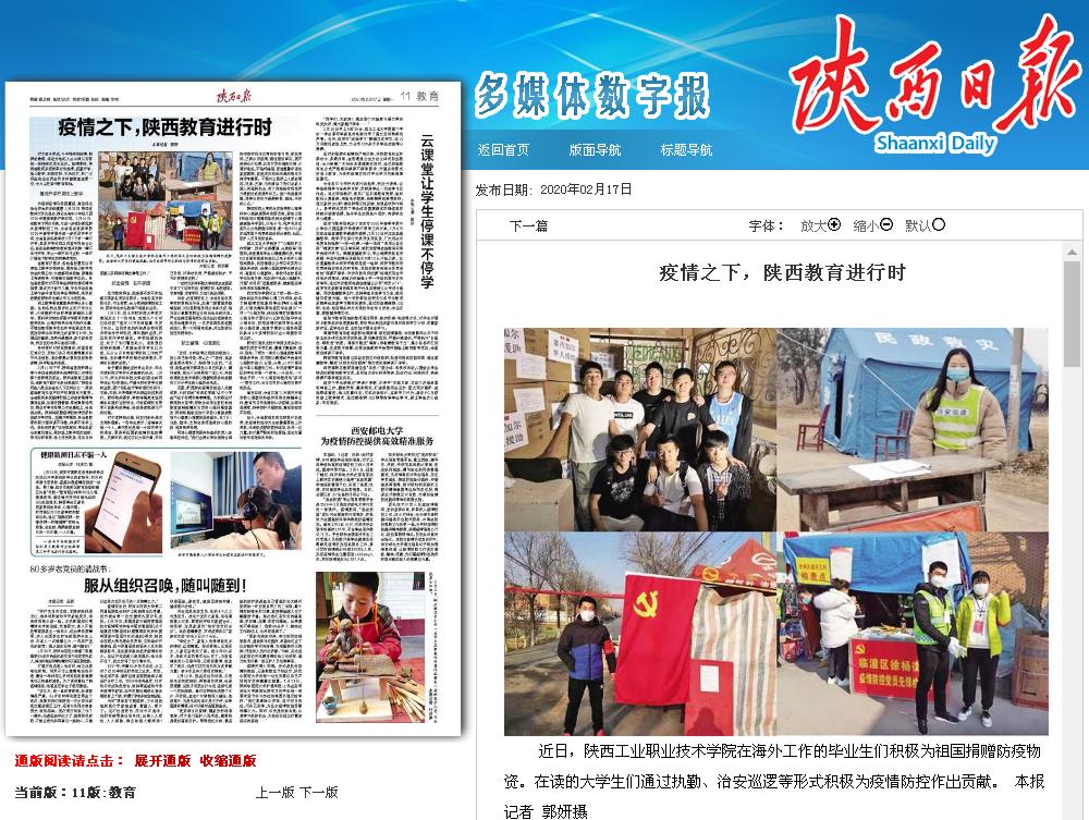 近日,陕西工业职业技术学院在海外工作的毕业生们积极为祖国捐赠防疫物资。在读的大学生们通过执勤、治安巡逻等形式积极为疫情防控作出贡献。