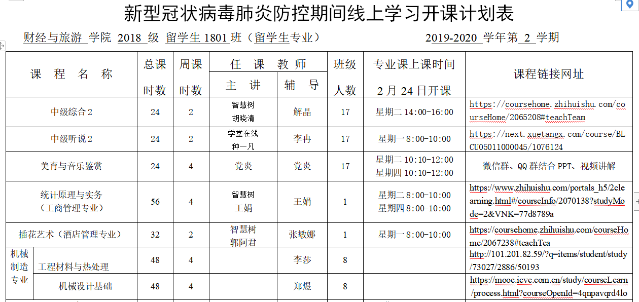 针对留学生的课程内容,代课教师前期精心选择对应网课,充分利用智慧树、学堂在线、智慧职教、微知库等平台组织教学,实时利用微信、QQ等工具督促学生在线学习和同步答疑。辅导员深入宿舍指导留学生熟练使用在线教学平台和工具。财经与旅游学院主动谋划,积极作为,在调研了课程设置内容和学生学习状态后,添加了“美育与音乐鉴赏”课程,以此丰富留学生在“疫情”期间的课程类型,调动学习积极性。