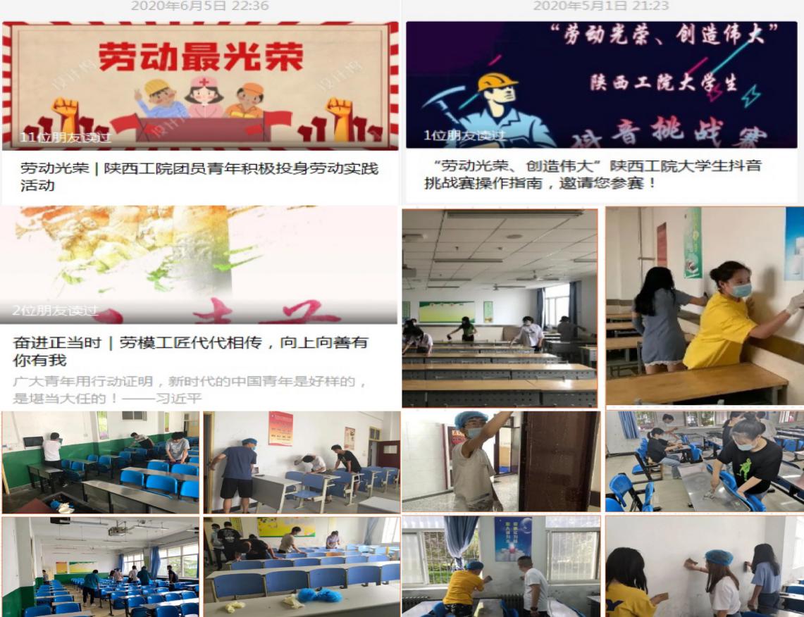融合劳动教育,汇聚多方合力。围绕“崇尚劳动美,奋斗中国梦”的主题,注重劳动教育与其他“四育”融合,开展“劳动文化月”。院团委制定实施方案,全面启动为期1个月的劳动实践活动。各二级学院团总支组织召开“劳动最光荣,争做先行者”和“净化教室环境,共创文明校园”主题团日活动,组织团学干部带头,按照教室劳动任务单,对标教室净化与美化评分标准,参与劳动实践活动。