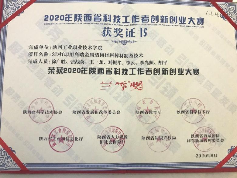 8月26日--27日,由陕西省科协、发改委、教育厅、科技厅、工信厅、人社厅、知识产权局、沣东新城管委会共同主办的2020年陕西省科技工作者创新创业大赛在西安举行。乐游棋牌钛合金技术开发团队的“3D打印用高端金属结构材料棒材制备技术”项目荣获三等奖。