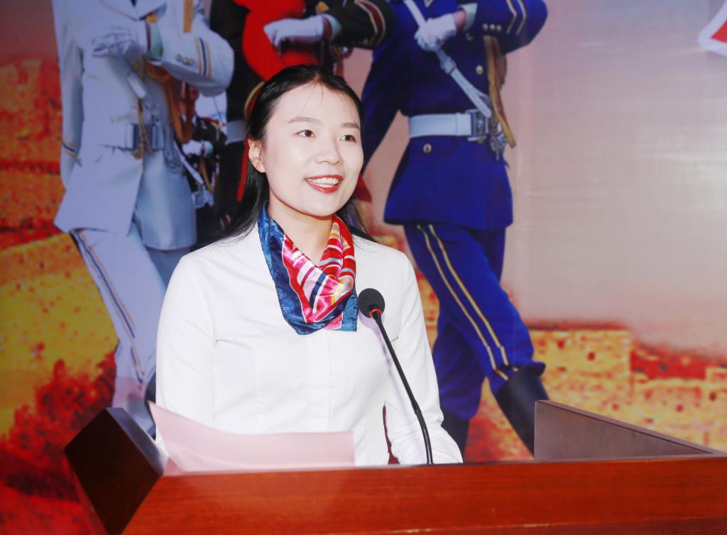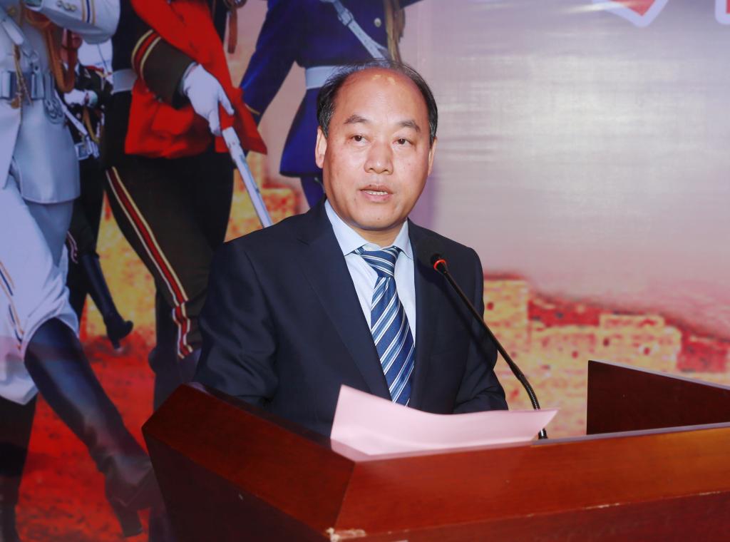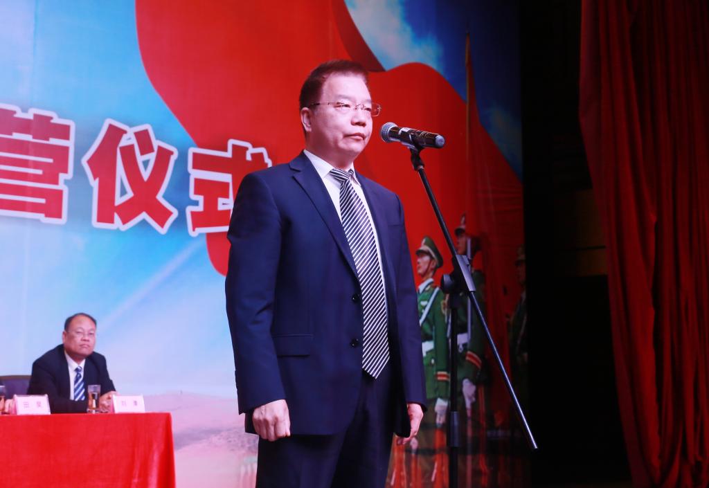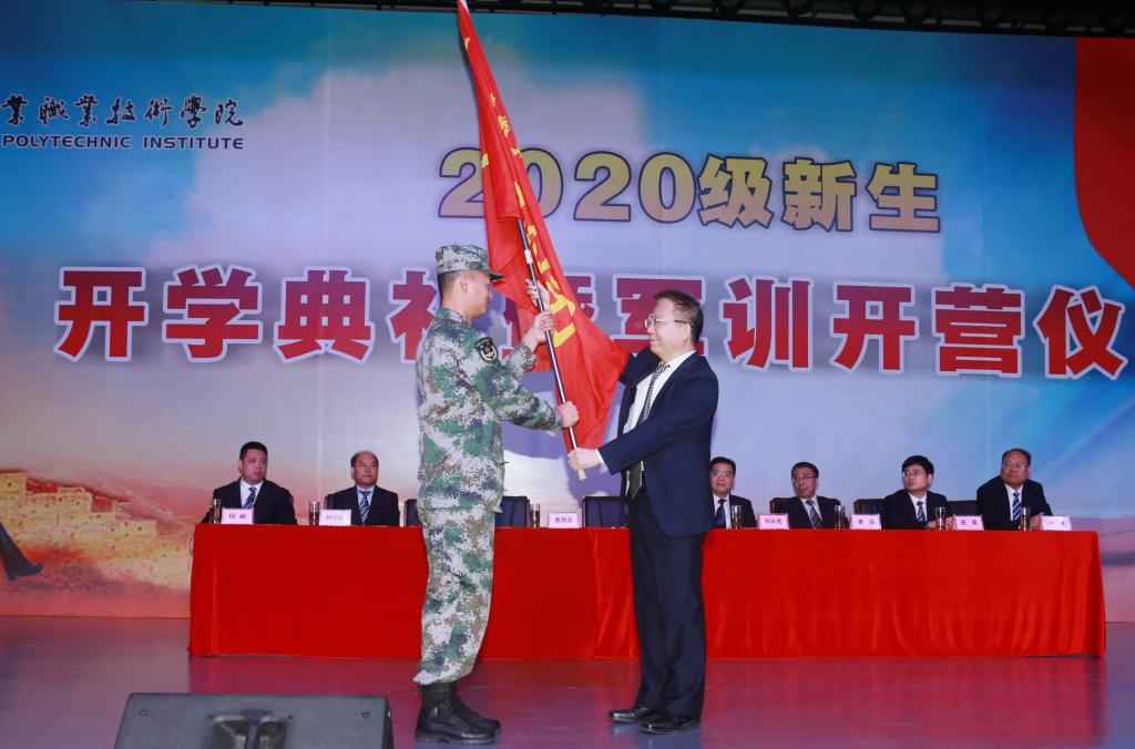 最后,学院副院长梅创社宣布军训团编制及任命。党委书记惠朝阳为新生军训团授旗并宣布2020级新生军训开营。
