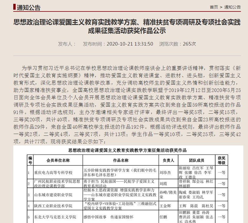 近日,由全国高校思想政治理论课实践教学联盟举办的思想政治理论课爱国主义教育实践教学方案、精准扶贫专项调研及专项社会实践成果征集活动结果揭晓,乐游棋牌提交的《“校内研学+VR体验+工坊创练”三维融创式爱国主义实践教学方案》荣获一等奖。根据活动评选规则,本次活动最终评出一等奖5项,二等奖15项,三等奖20项,共计40项。