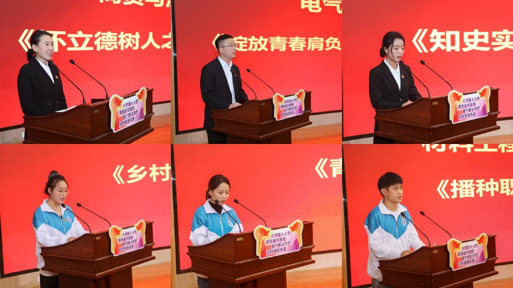 商贸与流通学院薛媚老师、电气工程学院赵松老师、信息工程学院张斯瑶老师、材料工程学院宁二立同学、航空工程学院郑方圆同学、财经与旅游学院杜佳雯同学依次作交流发言和经验分享。他们用生动的语言分享了关于学思践悟四史实践教育、红色革命历史发掘调研、技能帮扶助力脱贫攻坚、劳动与职业启蒙教育、禁毒防艾共创绿色家园、青春聚力助力乡村振兴等方面内容,赢得了现场师生的点赞和喝彩。