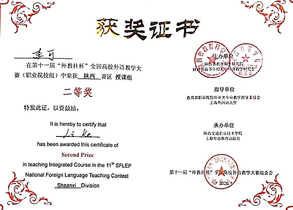 11月7日,第十一届“外教社杯”全国高校外语教学大赛陕西赛区比赛在陕西交通职业技术学院举行。本次大赛旨在进一步落实《国家职业教育改革实施方案》,推进职业院校外语师资队伍建设,提升外语教学水平和教育质量。经过激烈比拼,乐游棋牌公共课部外语教研室兼任教师李可,荣获决赛二等奖。