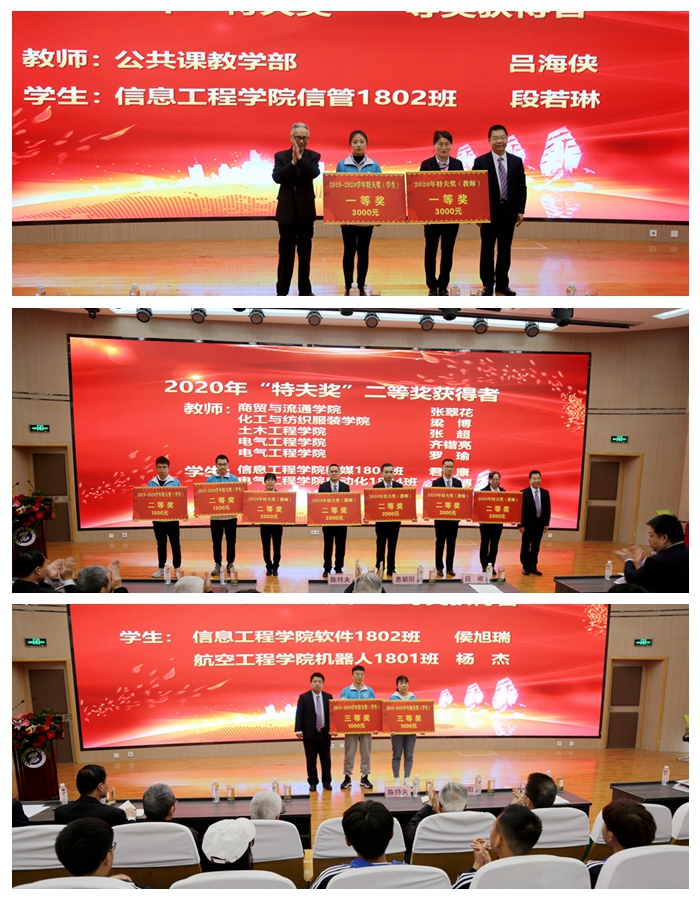 与会领导首先为2020年“特夫奖”获奖师生颁奖:获得一等奖的公共课教学部教师吕海侠 、信息工程学院信管1802班段若琳,获得二等奖的商贸与流通学院教师张翠花、化工与纺织服装学院教师梁博、土木工程学院教师张超、电气工程学院教师齐锴亮、电气工程学院教师罗瑜、信息工程学院数媒1805班君康、电气工程学院自动化1804班王新博和获得的信息工程学院软件1802班侯旭瑞、航空工程学院机器人1801班杨杰上台领奖。