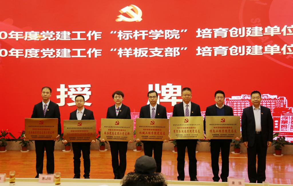 会上,康强同志宣读了《2020年度党建工作标杆学院、样板支部培育创建单位名单》《党支部书记微党课大赛获奖人员名单》《2020年“一总支一品牌,同读一本书”活动获奖名单》。惠朝阳同志为2020年度党建工作标杆学院、样板支部培育创建单位授牌,康强同志、贺天柱同志、田昊同志分别为党支部书记微党课大赛、2020年度“一总支一品牌,同读一本书”活动获奖单位和个人颁奖。标杆学院培育创建单位代表闫军同志(信息工程学院党总支书记)、样板支部培育创建单位代表王丁同志(教务党总支图书馆党支部书记)依次作了表态发言。