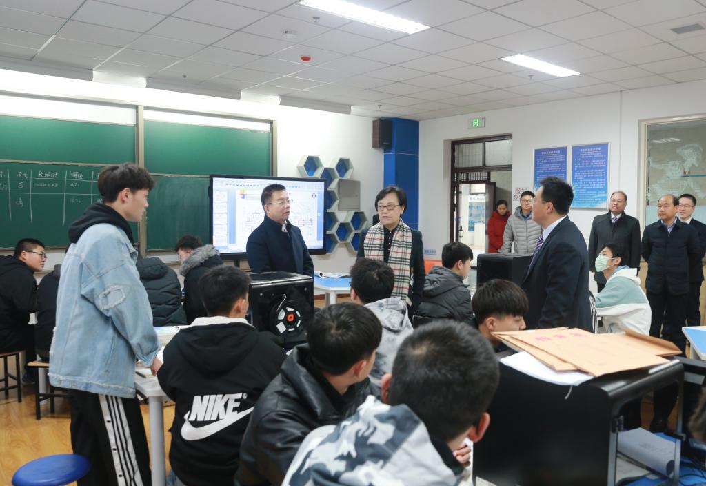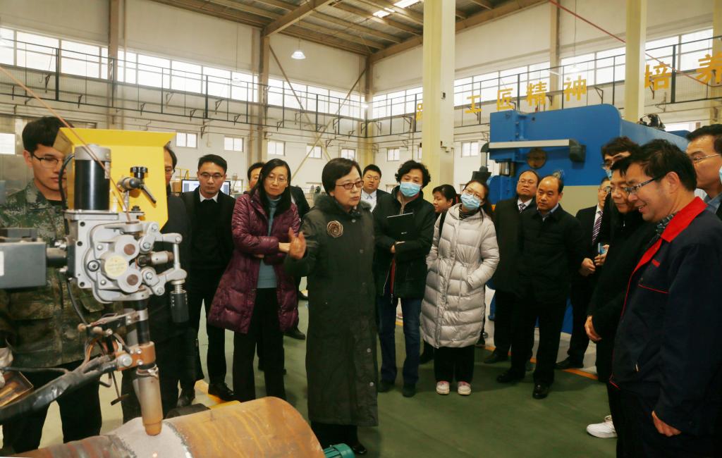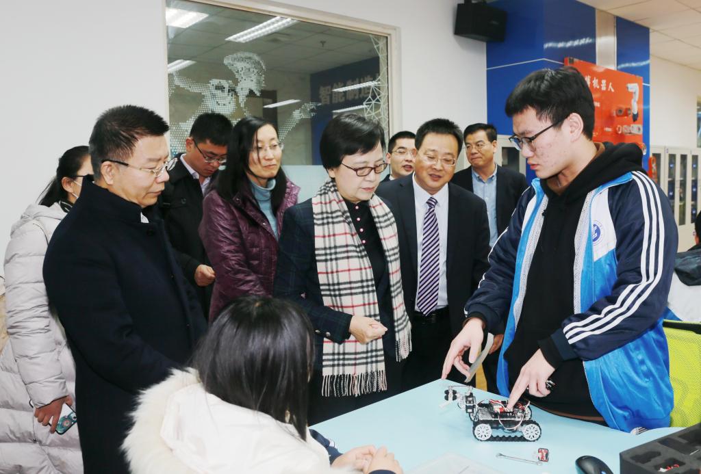 在智能制造协同创新中心,鲁昕会长一行认真听取了介绍,希望中心对标时代要求,利用新思维、借助新技术、把握新机遇,拉高标杆,加强合作,加压奋进,争创一流;在焊接实训基地,她了解了我校钛合金科研团队与重点本科院校的合作交流,赞扬我校在实验室与市场流通间所起到的桥梁纽带作用;在智能微电网实训室,她充分肯定了实训室在新能源开发、利用、储存方面的研究以及在培养学生创新创业能力方面的努力,鼓励师生开阔思维,努力在我校打造青年大学生创新创业的新高地,为区域创新驱动发展提供重要战略支撑。