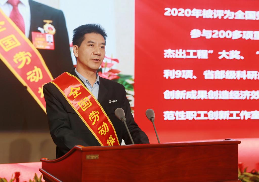 全国劳动模范、三秦工匠、中国航发西安航空发动机有限公司工具厂53车间二工段工具钳工班组组长夏复山作报告