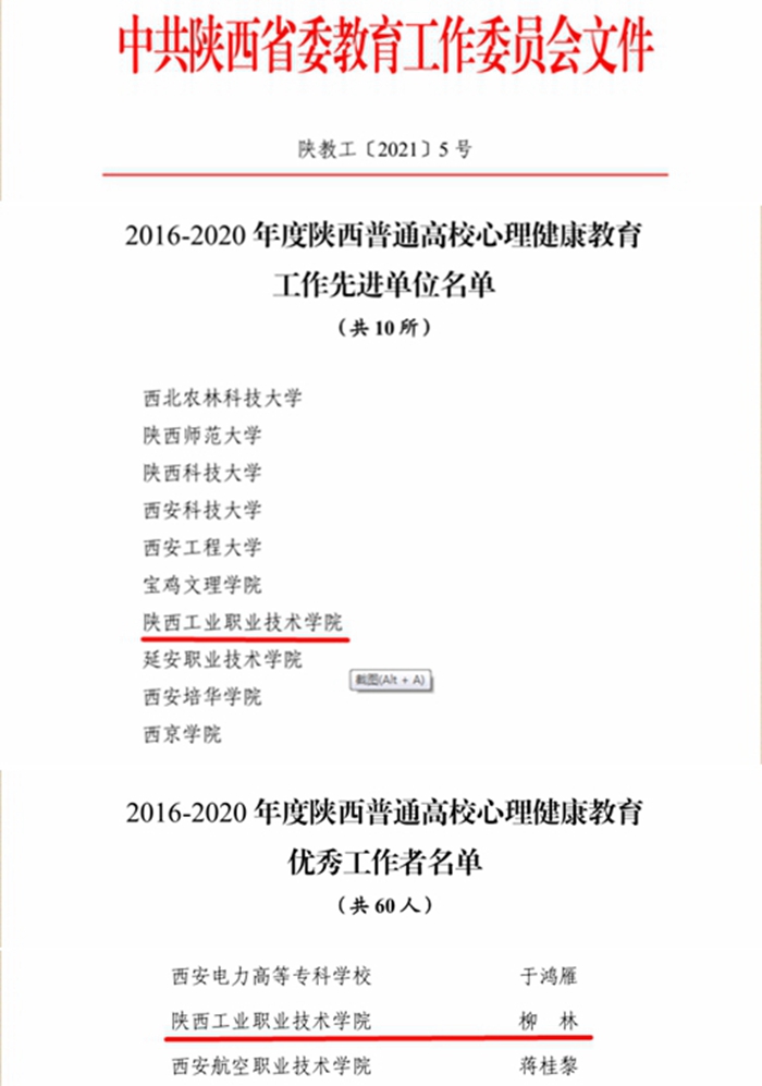 为贯彻落实《高等学校学生心理健康教育指导纲要》和《陕西普通高等学校学生心理健康教育工作建设规划(2016-2020年)》(陕高教生〔2015〕5号),大力培养选树新时代高校心理健康教育先进典型,省委教育工委开展了2016-2020年度陕西普通高校心理健康教育先进单位和优秀工作者评选表彰活动。乐游棋牌荣获“2016-2020年度陕西普通高校心理健康教育工作先进单位”,乐游棋牌心理咨询中心教师柳林荣获“2016-2020年度陕西普通高校心理健康教育优秀工作者”。