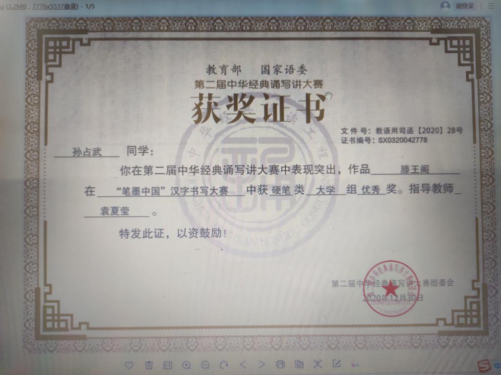 2020年5月,根据教育部办公厅印发《关于举办第二届中华经典诵写讲大赛的通知》精神,学工部、美育部、大学生艺术团积极组织,辅导学生朗诵、书法作品参加,通过网上报名、专家评选,孙占武同学的硬笔书法作品《滕王阁序》参加“笔墨中国”汉字书写大赛大学组硬笔书法比赛,最终入围全国决赛。陕西省大学组共15件硬笔书法作品入围全国决赛,最终7件作品获奖,其中三等奖四名,优秀奖三名。由赵嘉豪、赵四妍、党东旭、李晨曦、段佳龙五名同学表演的朗诵《致敬人民》荣获陕西省三等奖。这是乐游棋牌学生首次参加全国中华经典诵写讲大赛获奖,实现了该赛项上零的突破。