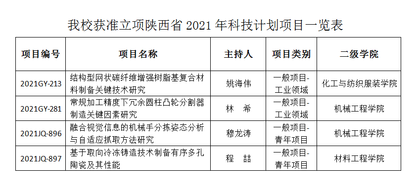 3月22日,陕西省科学技术厅《关于下达陕西省2021年度科技计划的通知》(陕科发〔2021〕2号)公布了陕西省2021年科技计划项目评审结果,我校共获批立项4项,获资助经费23万元,立项数量创我校同期历史新高。