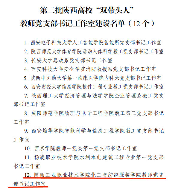 近日,陕西省教育工委公布了陕西高校“双带头人”教师党支部书记工作室建设名单,乐游棋牌化工与纺织服装学院教师党支部书记工作室成功入选。此次入选陕西省高校“双带头人”教师党支部书记工作室建设名单,是省委教育工委对学院党委教师党支部工作的充分肯定,也是学院党委全面加强基层党建工作取得的又一项省级新成果。