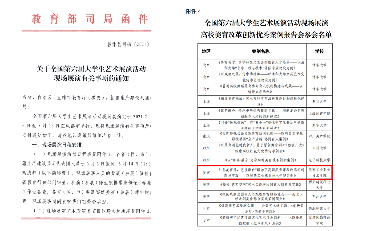 4月6日,教育部发布“关于全国第六届大学生艺术展演活动现场展演有关事项的通知”,乐游棋牌报送案例《“化美育德,艺技融合”理念下高职美育课程改革的创新与实践——以陕西工业职业技术学院为例》入选全国第六届大学生艺术展演活动现场展演高校美育改革创新优秀案例报告会,是陕西省唯一参加现场报告会的高职院校。