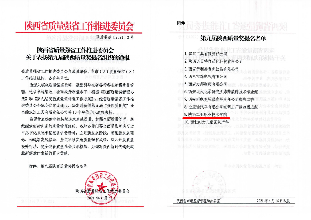 近日,陕西省质量强省工作推进委员会对获得第九届陕西质量奖提名组织进行了通报表扬,我校是全省教育系统唯一获此殊荣的院校。