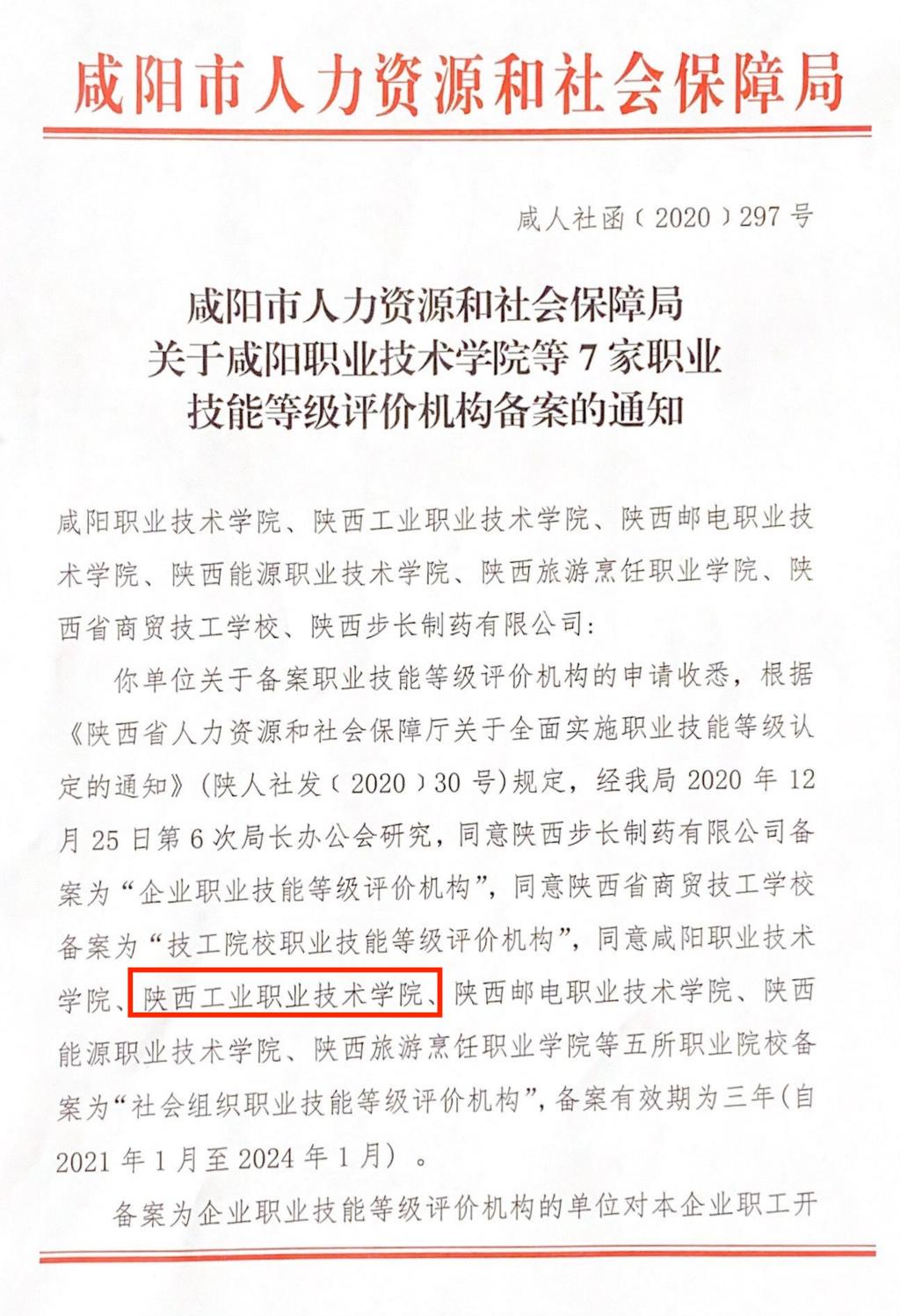 近日,咸阳市人力资源和社会保障局印发《关于咸阳职业技术学院等7家职业技能等级评价机构备案的通知》,公布了咸阳市7家职业技能等级评价机构名单,我校被认定为“社会组织职业技能等级评价机构”。