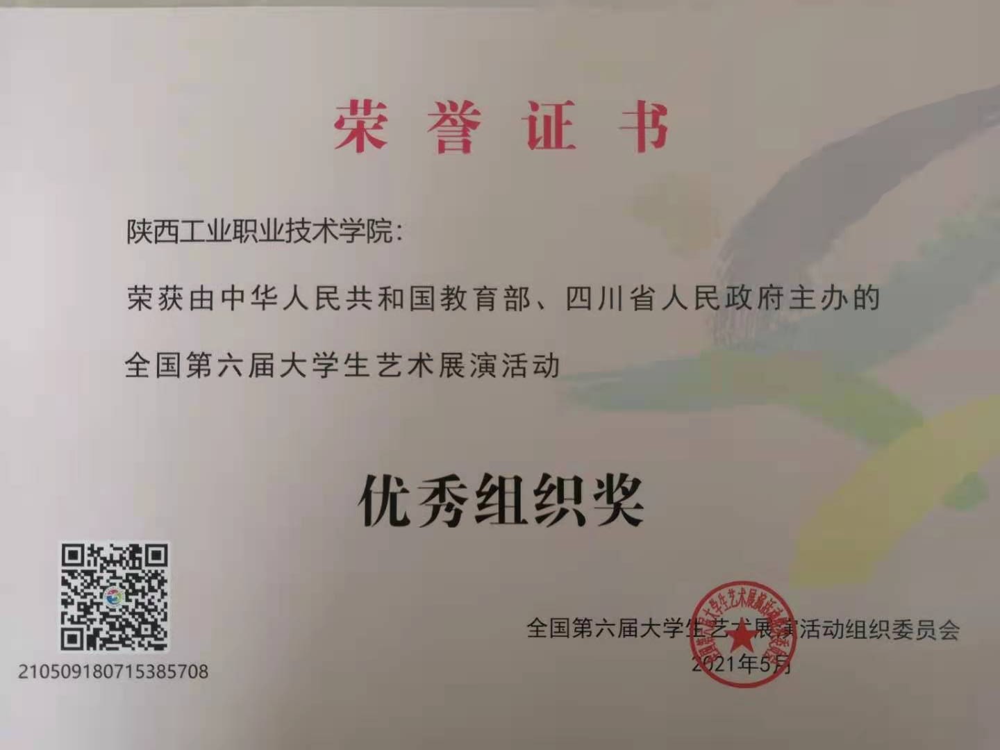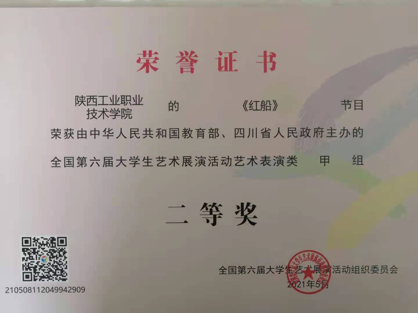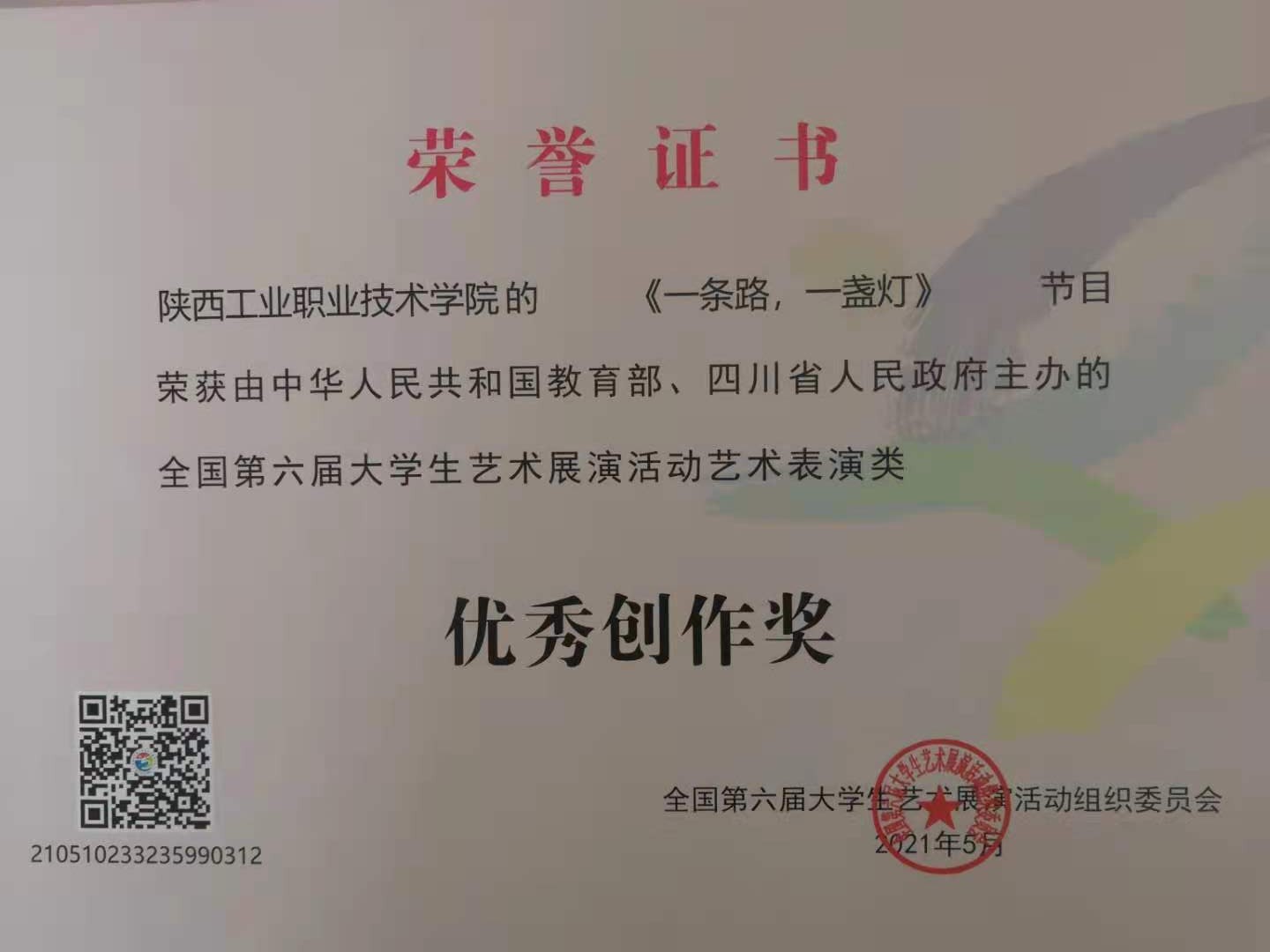 5月12日,全国第六届大学生艺术展演活动在成都圆满落幕,我校入围全国大艺展的3个项目——朗诵《一条路一盏灯》、舞蹈《红船》、案例《“化美育德,艺技融合”理念下高职美育课程改革的创新与实践——以陕西工业职业技术学院为例》与本科院校同台竞技,荣获全国“一等奖”2项、“二等奖”1项、“优秀创作奖”1项,学院荣获“优秀组织奖”,是全国唯一荣获2项一等奖的高职院校,也是陕西省唯一荣获全国奖项的高职院校,展演成绩创学院历史新高。