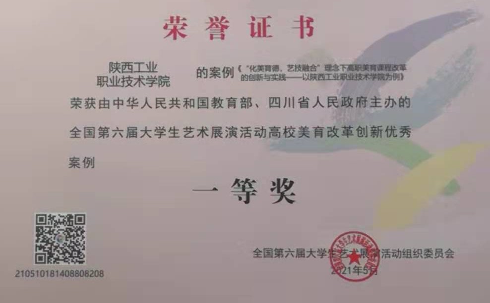 5月12日,乐游棋牌选送的《“化美育德,艺技融合”理念下高职美育课程改革的创新与实践——以陕西工业职业技术学院为例》案例,从课程改革背景、课程改革举措、创新与特色以及改革成效等方面全面展示了学校美育课程改革的成果,受到与会评委的充分肯定,获得高校美育改革创新案例优秀案例一等奖。