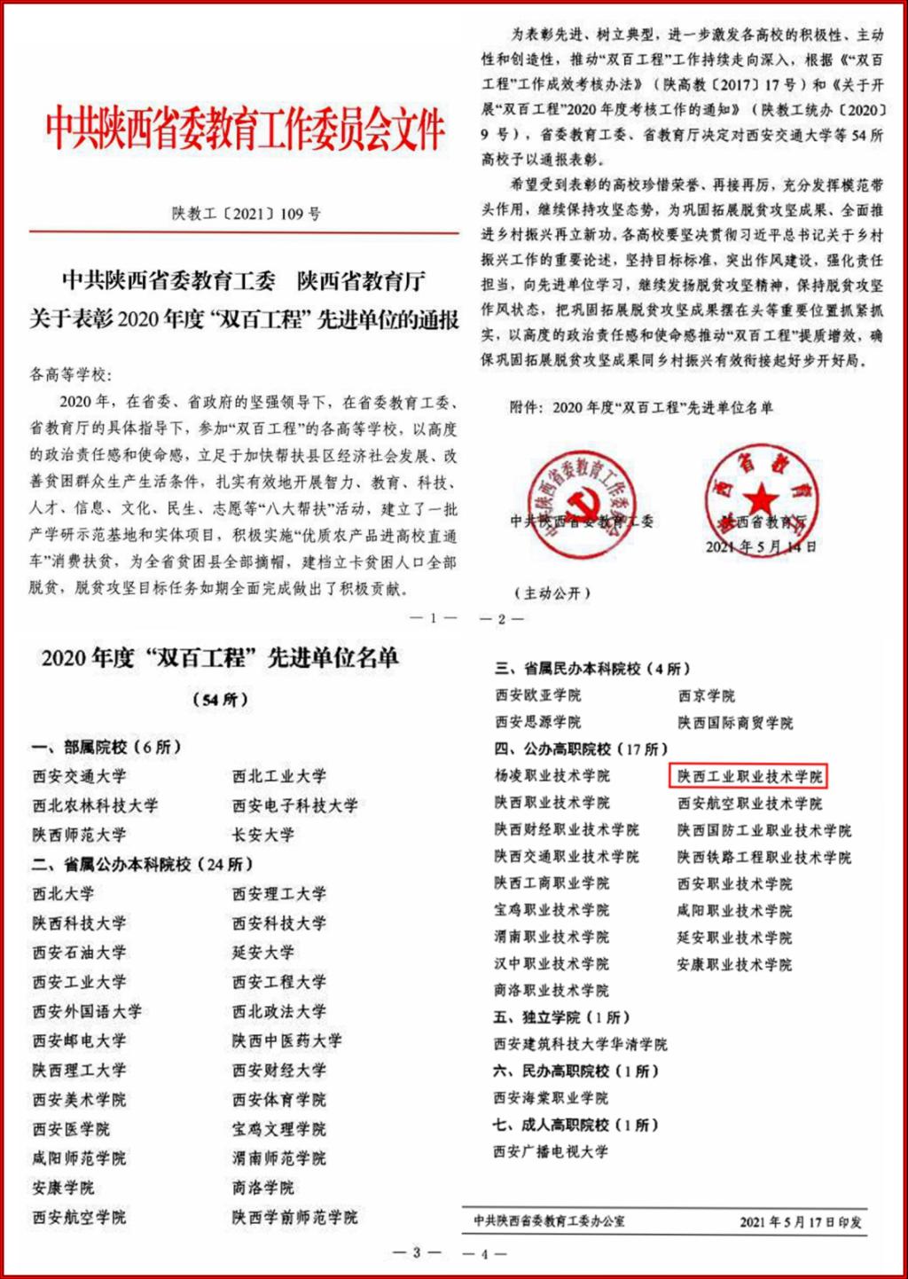 日前,中共陕西省委教育工委 、陕西省教育厅下发《关于表彰2020年度“双百工程”先进单位的通报》(陕教工【2021】109号)文件,我校在2020年度“双百工程”脱贫攻坚工作考核中荣获先进单位。