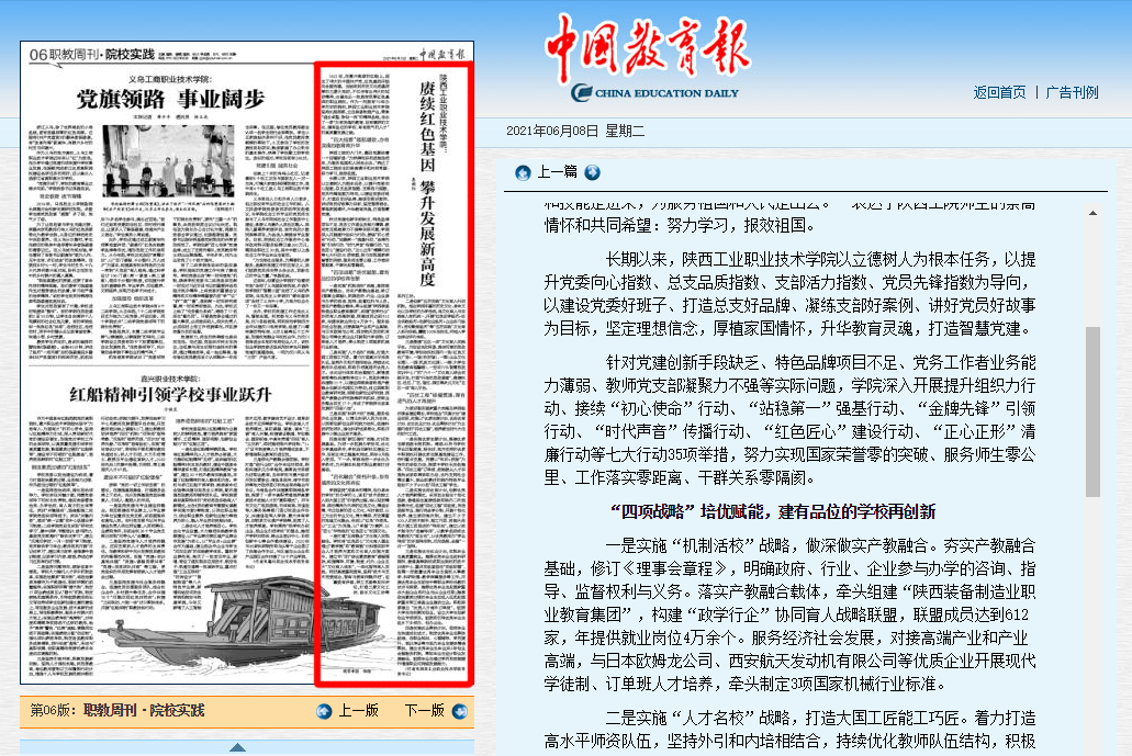 今日出版的《中国教育报》在其职教版刊发我校党委书记惠朝阳同志题为《陕西工业职业技术学院:赓续红色基因,攀升发展新高度》的署名文章,现全文转载如下: