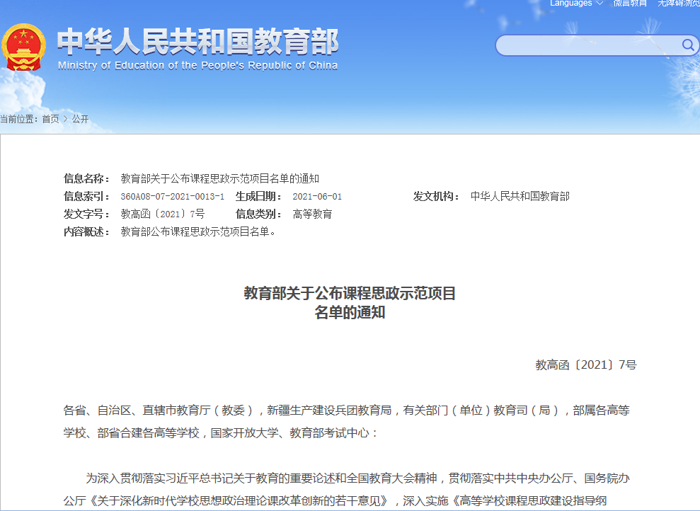 我校1个中心2门课程被确定为教育部课程思政示范项目