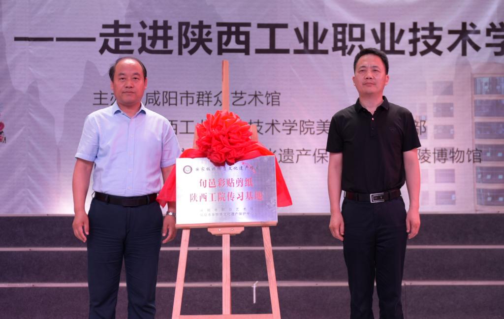 学院副院长梅创社致辞,他表示学院重视非物质文化遗产在学生人才培养中所发挥的导向作用,希望借此次机会,厚植学生文化艺术底蕴,活跃校园文化艺术活动,进一步传承和弘扬中华优秀传统文化,提高学生文化审美素养、促进学生健康成长。市群艺馆馆长、市非遗保护中心主任李军为旬邑彩贴剪纸—陕西工院传习基地授牌。他表示借此次与高校合作的机会,扩大了非遗的社会影响,对传承和发扬民间艺术具有重要的意义。