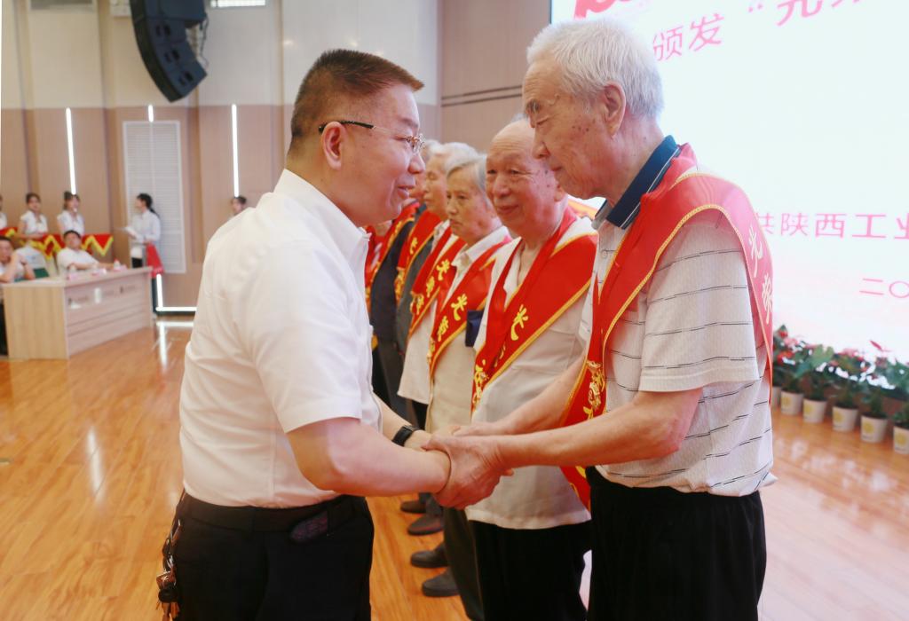 校长刘永亮同志为“光荣在党50年”老党员代表佩戴纪念章