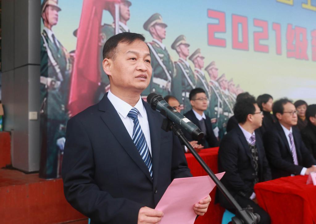 最后,副校长梅创社宣布军训团编制及任命。党委书记惠朝阳宣布2021级新生军训正式开营。