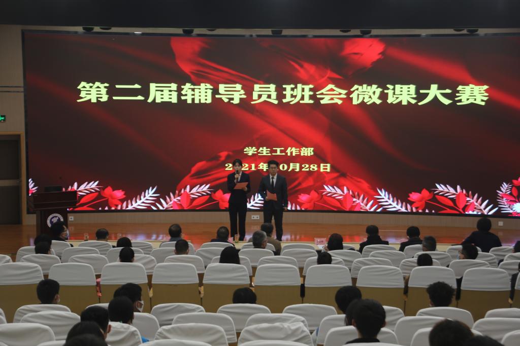 为打造一支高素质辅导员队伍,提升我校辅导员队伍建设水平,10月28日下午,在学术会堂举办了第二届辅导员班会微课大赛。学校党委副书记贺天柱、学生工作部(处)长郝军、各二级学院党总支书记、学工办主任、全体辅导员、学生处科级以上干部,以及来自各二级学院的学生代表共计120余人到场观摩比赛。
