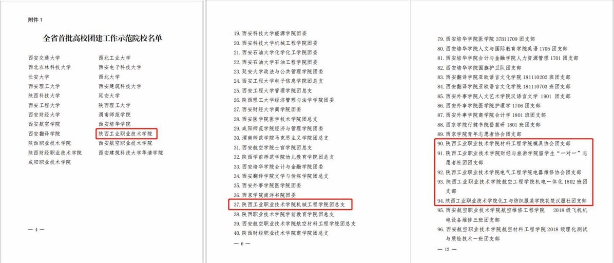 近日,共青团陕西省委、中共陕西省委教育工委下发《关于全省首批新时代高校团建示范创建结果的通报》(陕团联发〔2021〕42号),通报了我省23所高校,45个院系,112个团支部通过全省首批新时代高校团建示范创建验收。其中我校团委通过示范院校验收,机械工程学院团总支通过标杆院系验收,模具协会团支部、留学生“一对一”志愿者社团团支部、电器维修协会团支部、机电一体化1802班团支部、苌楚汉服社团支部分别通过样板支部验收。