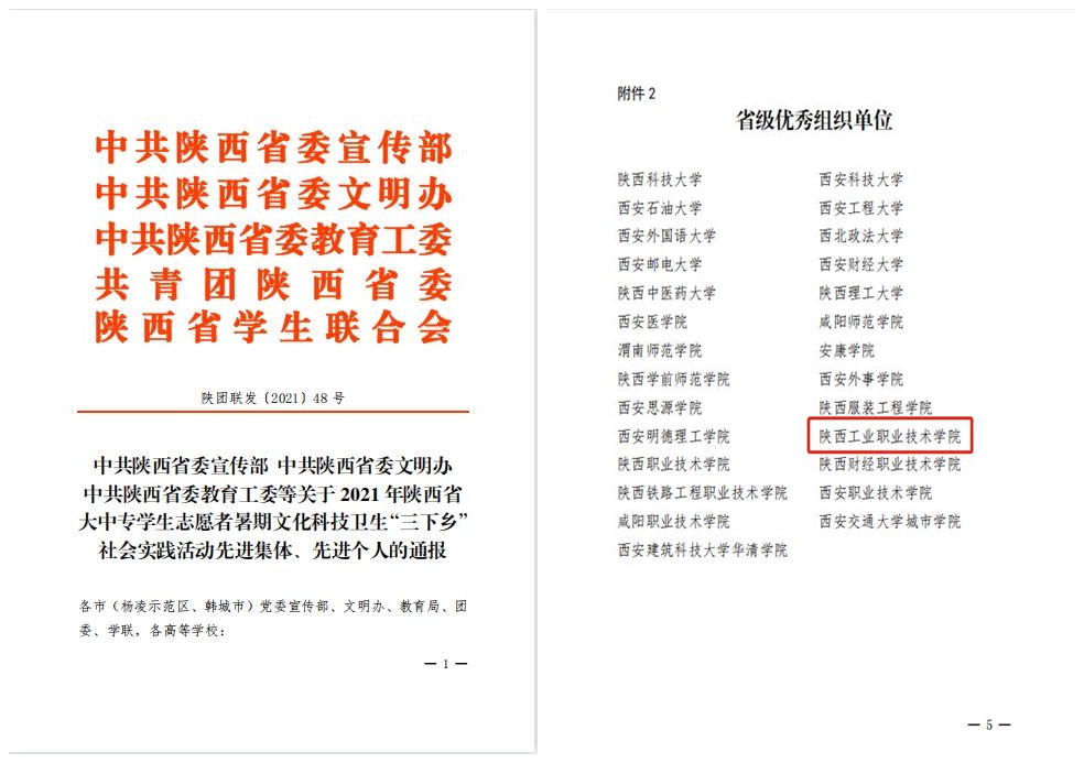 近日,由省委宣传部、省委文明办、省委教育工委、团省委、省学联联合组织开展的2021年陕西省大中专学生志愿者暑期文化科技卫生“三下乡”社会实践活动落下帷幕。经各单位遴选推荐、资格审查、综合评议等环节。我校荣获“省级优秀组织单位”,“志存高远,星火燎原”社会实践团和“技能筑梦”红色工业实践团荣获“省级优秀团队”,信息工程学院李路和电气工程学院李瑞欣荣获“省级先进个人”,《乡村振兴战略视域下新时代乡村治理体系探究---以咸阳市淳化县为例》荣获“省级优秀调研报告”。