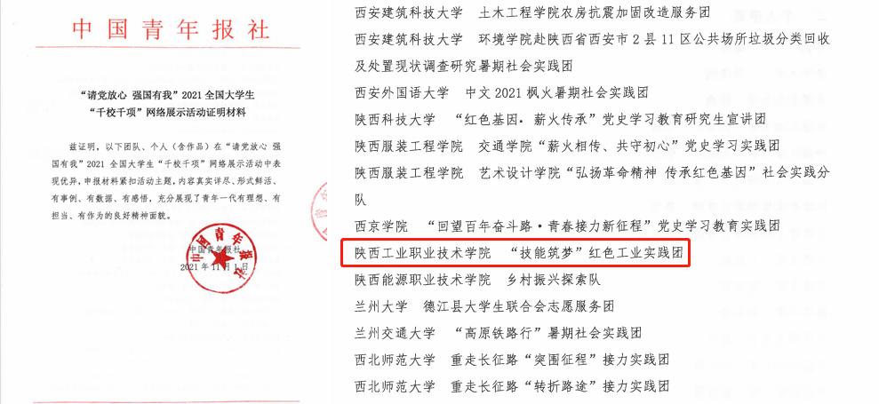 近日,“请党放心 强国有我”2021全国大学生“千校千项”网络展示活动遴选结果公布。我校大学生暑期社会实践团—电气学院“技能筑梦”红色工业实践团,经过资格筛选、网络点赞和专家评审等环节,从全国14220份作品中脱颖而出,以工院学子有理想、有担当、有作为的良好精神面貌,最终获评“团队风采”荣誉称号。