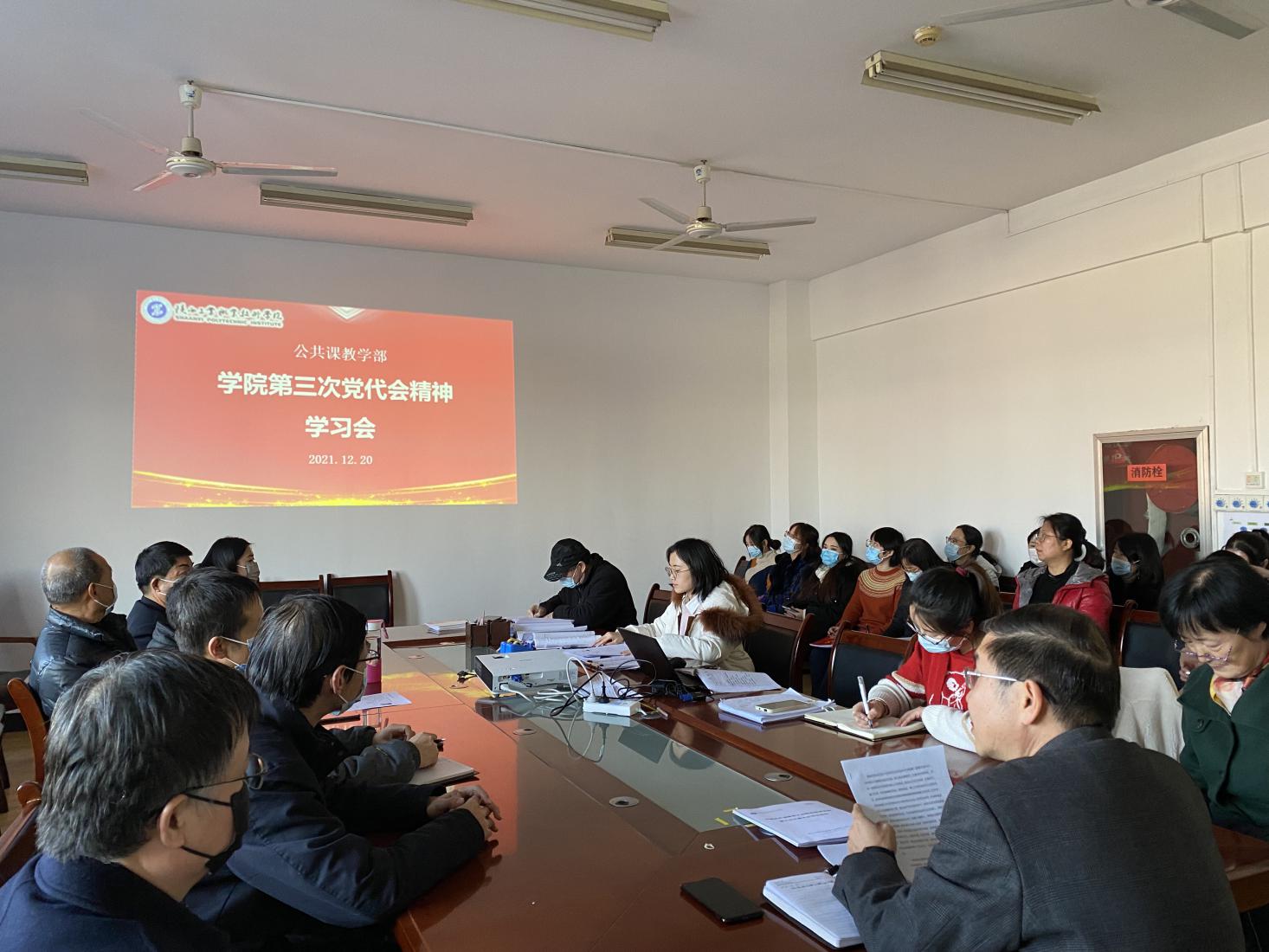 12月20日下午, 公共课教学部召开会议,专题学习学校第三次党代会精神,公共教学党总支书记、公共课教学部部长南欢主持会议,全体教师参加。南欢同志传达了学校第三次党代会的基本情况,重点领学了党委书记惠朝阳同志代表中共陕西工业职业技术学院第二届委员会向大会做题为《聚焦内涵式发展、聚力高质量提升,为建设中国特色、世界一流职业大学而接续奋斗》的报告和纪委书记康强同志代表中共陕西工业职业技术学院第二届纪律检查委员会做《围绕中心服务大局 为学院事业高质量发展提供坚强纪律保障》的报告。大家一致表示,宏伟蓝图已经描绘,接下来就是怎样落实,作为教师,要认真学习贯彻落实党代会精神,立足岗位,脚踏实地,以胸怀世界的谋划引领发展,以敢为人先的气魄抢抓机遇,以众志成城的信念争创一流,更加紧密地团结在以习近平同志为核心的党中央周围,凝心聚力,锐意进取,深化改革,创新发展,为建设中国特色、世界一流职业大学而接续奋斗。