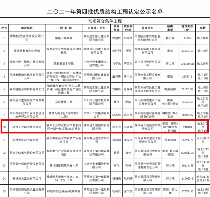 近日,根据陕西省建筑业协会《关于2021年度第四批优质结构、绿色施工、创新技术应用工程评审结果的公示》,由陕西建工集团股份有限公司EPC总承包、陕西省工程监理有限公司监理的乐游棋牌新校区一期一批项目被评定为“陕西省建筑业优质结构工程”。此系该项目获评“陕西省文明工地”之后的又一新成果,为参评“长安杯”(陕西省优质建设工程)奠定了基础。