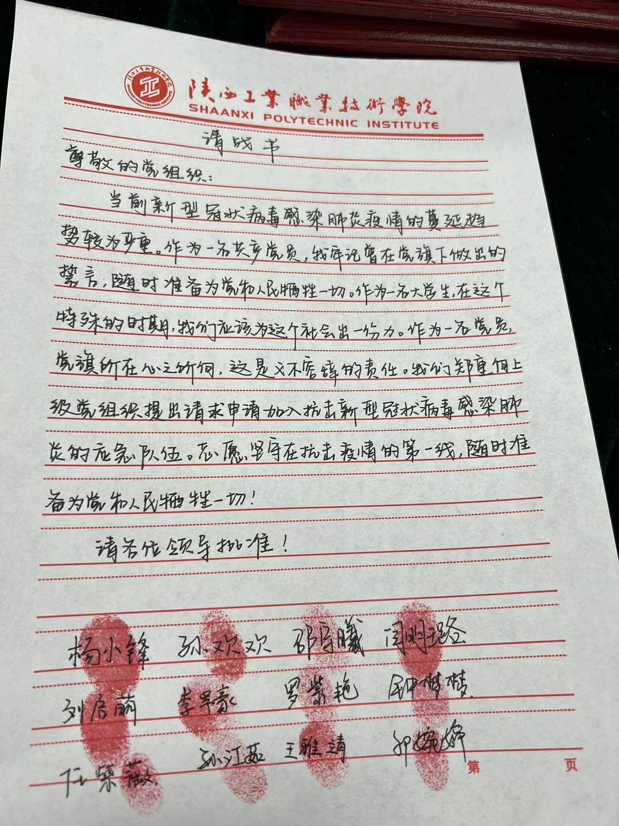 12月25日,财经与旅游学院党总支学生第一、二党支部学生党员、入党积极分子向党组织递交了一封请战书。用12个鲜红的手印、字字铿锵的誓言表示他们志愿加入学校疫情防控的服务工作中来,自觉做科学的传播者、谣言的粉碎者,保持乐观心态,积极配合老师的工作,认真准备、按时上课、遵守纪律,学习不停歇,为重返教室做更好的积累。财经学院的情况并非个例,“如何成为一名抗疫志愿者,如何为疫情防控贡献自己的力量?”早在抗疫之初就成为了很多工院学子关心的问题。“想为学校尽一点心,出一份力”,质朴的语言让这个寒冷的冬天充满了温情。