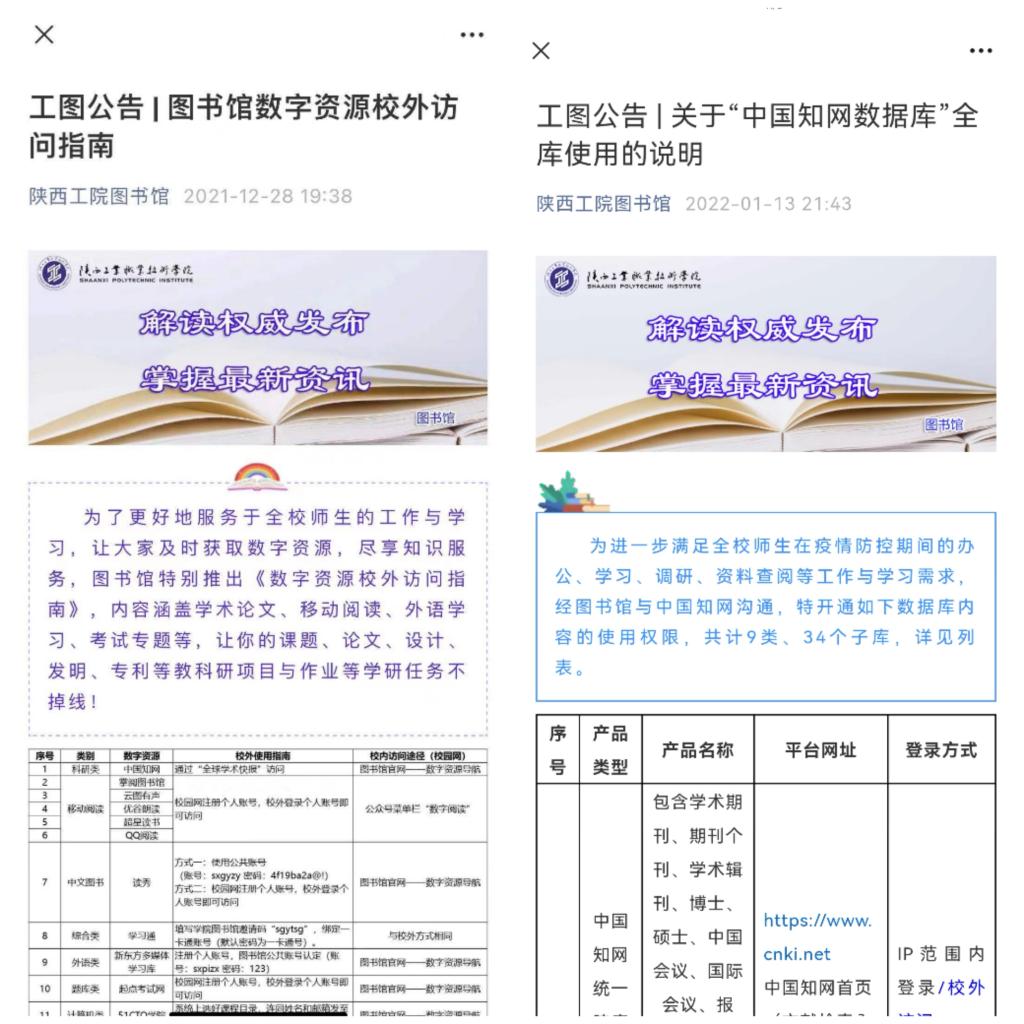 学校实施封闭管理、线上教学后,部分教师居家上课、办公,为解决我校教职工在办公、教学、科研、资料获取的不方便,图书馆及时将各类数字资源的文献传递、校外漫游服务方式进行更新,及时发布数字资源校外访问指南。针对我校教职工使用量最大的数字资源,图书馆积极与中国知网进行沟通,免费为我校开通了即日起至3月31日,中国知网旗下的所有数据库(9大类、33个子库)的全专辑、全库使用权限,并申请特殊访问方式,在陕西省IP范围内全部适用,全力保障我校师生的教科研。