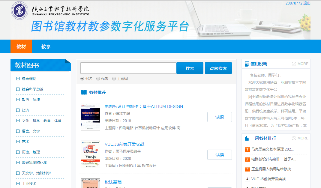 近日,图书馆教材教参数字化服务平台正式上线。平台当前已将我校2021-2022学年第2学期开设的所有课程教材进行匹配,精确匹配率近70%,其余30%为与课程教材名称同类的相关教材。我校师生可通过电子邮箱实现教材教参书籍的电子借阅,每人每天可借阅5本,每月可借阅30本。后续还将面向教师征集需使用的电子教材教参需求,持续在平台更新。