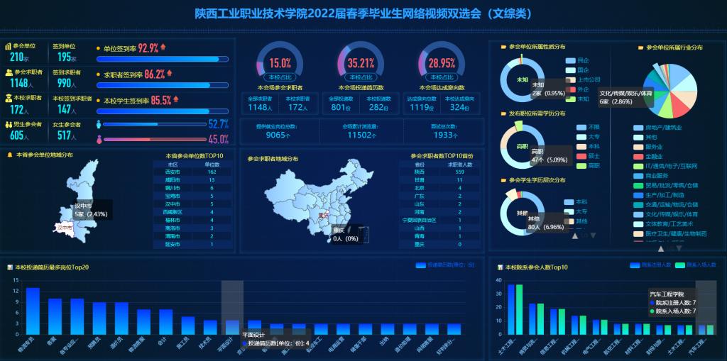 本次双选会邀请了陕西省旅游设计院有限责任公司、西安曲江文化旅游股份有限公司、西安建工市政交通集团有限公司等210家用人单位,其中民营企业186家,国企19家,上市公司3家,外企2家,共提供就业岗位9065个,参会学生1148人,投递简历801份,意向达成度达到96%以上。在网络双选会举办期间,用人单位点击“视频面试大厅”,可以查看学生投递的电子简历,与学生进行互动交流。学生足不出户就可以在网上了解各大招聘单位,通过发送电子简历、参加视频面试,双向选择合适的工作岗位。