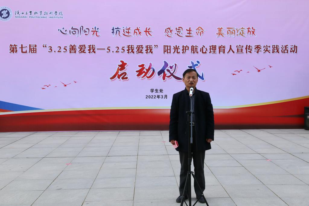 春风和煦,万物复苏。3月28日下午,我校第七届“3.25善爱我—5.25我爱我”阳光护航心理育人宣传季实践活动启动仪式在学校精艺楼前顺利举行。本次活动由学工部主办,首次采用了线上线下相结合的宣传方式。学校党委副书记贺天柱、学工部负责人、各二级学院党总支书记、学工办主任、二级学院心理工作站站长、各班心理委员及心理协会会员代表参加活动。