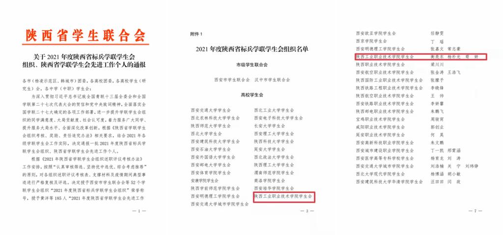 近日,陕西省学生联合会下发文件表彰了一批标兵学联学生会组织和先进工作个人。我校学生会荣获2021年度陕西省标兵学联学生会组织,校学生会轮值主席衡亮东、杨朴光、苟妍3名同学荣获陕西省学联学生会先进工作个人。本次受到表彰的学联学生会组织共52个,我校是唯一受表彰的高职院校。